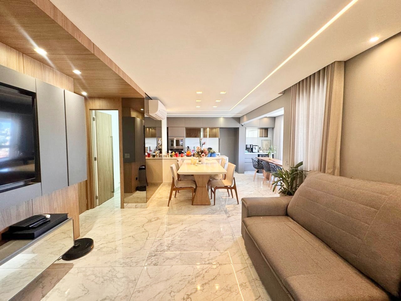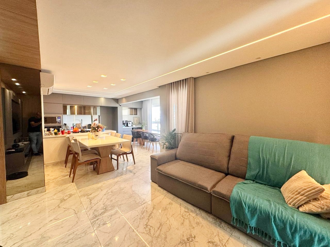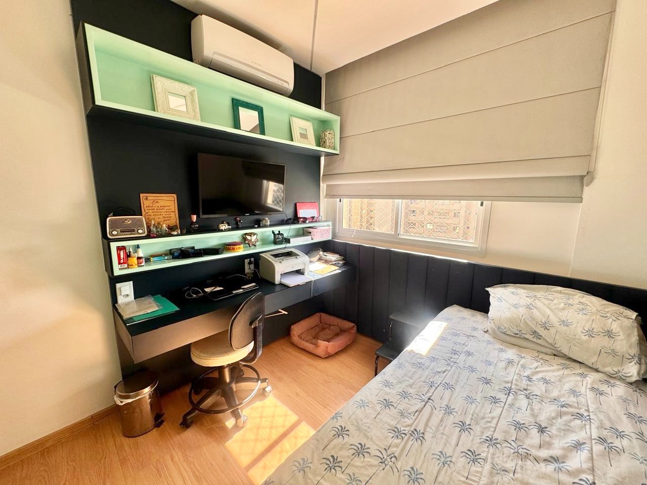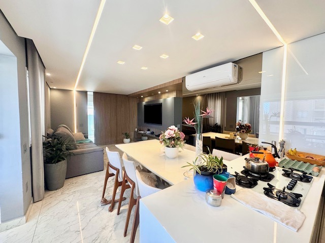 Maravilho apartamento com decoração de ótimo bom gosto com aproximadamente 110 m² possuindo 04 quartos (um deles foi transformado em escritório) sendo um deles suíte, ar condicionado em todos quartos, pisos em laminado, janelas em esquadria de alumínio, rebaixamento em gesso com projeto luminotécnico,01 sala espaçosa para 03 ambientes com piso em porcelanato, rebaixamento em gesso com projeto luminotécnico, ar condicionado, painel de tv, armários planejados, banheiro social com piso em porcelanato, pia em granito, armário, espelho, cozinha com pia e bancadas, piso em porcelanato, armários planejados de excelente qualidade, fogão cooktop, forno, coifa, área de serviço separada, armários planejados.